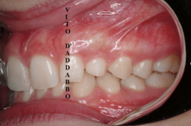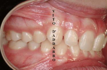 Non di rado accade che manchi in arcata il canino permanente superiore. Questo può essere dovuto a mancanza di spazio ma anche a problemi di eruzione del dente che si colloca lontano dalla propria sede. Nel caso di questa paziente, che presentava anche un grave morso coperto, il canino era dislocato palatalmente e molto distante dalla propria sede. Previo un piccolo intervento chirurgico è stato agganciato e portato in arcata.